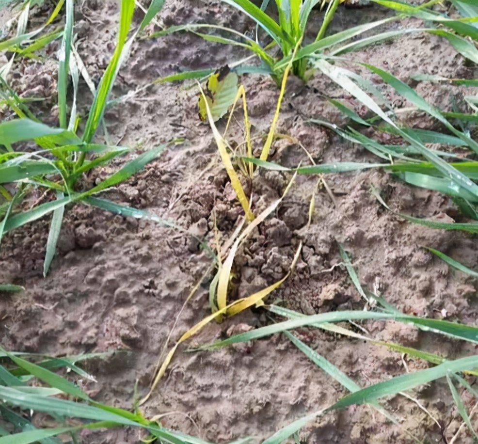 小麥發(fā)生金針蟲危害,已發(fā)黃死亡