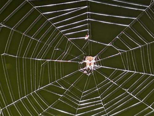 圓網時,首先要用蛛絲拉出個框架,再拉出圓網的“半徑線”,而且每兩個“半徑線”之間的夾角正好相等,就像事先用尺子量過那樣精確。然后,蜘蛛從網的中心向外盤旋,一圈一圈地往外織,織成一個圓網。